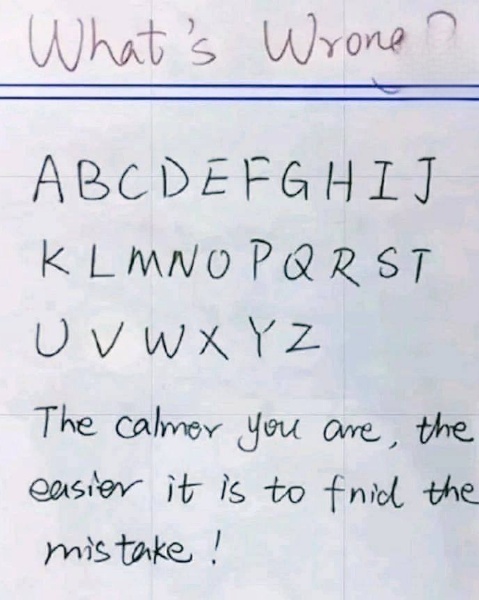 The image shows the alphabet, written neatly in uppercase letters, followed by a calming sentence: “The calmer you are, the easier it is to find the mistake.” Seems straightforward, right? But trust us—something is definitely wrong.